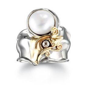 925 Silver and 14k Yellow Gold Ring with Pearl and Diamond